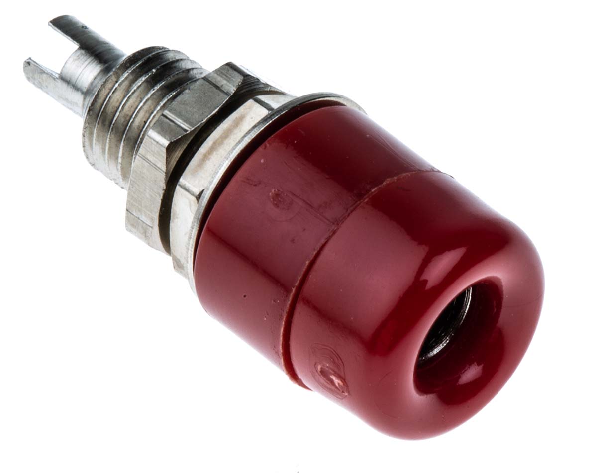 This is Red 4mm Socket Nickel Plated 30 V ac 60 V dc 20A manufactured by Schutzinger. The manufacturer part number is IBU401/RT. The product has a current rating of 20a. Moreover, the product has a nominal 30 v ac, 60v dc voltage rating. In addition, female is the available "Gender" of the product. Its accurate length is 22.8mm. It comes in banana socket configuration. The product is made from sturdy brass materials.