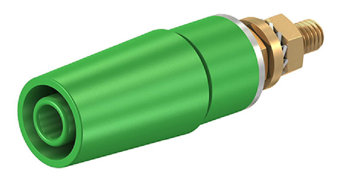This is Multi Contact Green Female Banana Plug - Bolt 600V manufactured by Staubli. The manufacturer part number is 23.3050-25. The product has a current rating of 32a. Moreover, the product has a nominal 600v voltage rating. In addition, female is the available "Gender" of the product. Its accurate length is 45mm. It has a robust polyamide insulation material. The product is made from sturdy brass materials. It comes in banana socket configuration.