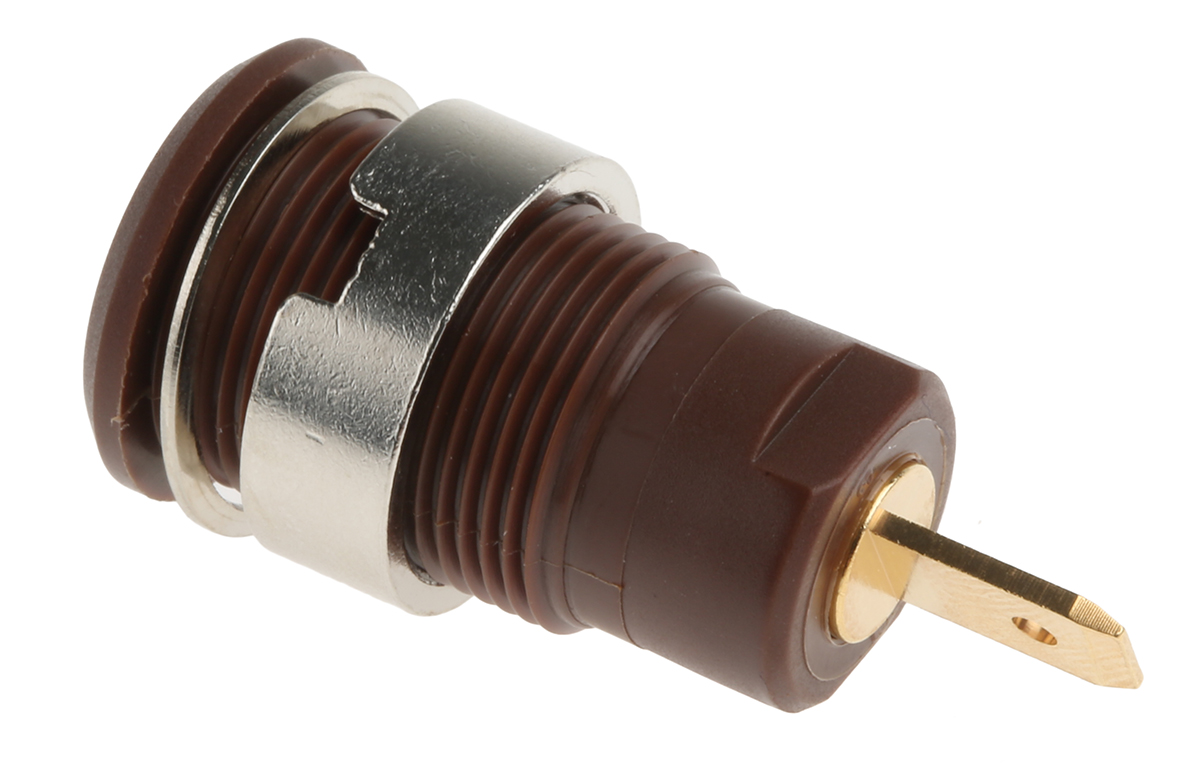 This is Multi Contact Brown Female Banana Plug - Tab 1kV manufactured by Staubli. The manufacturer part number is 23.3000-27. The product has a current rating of 24a. Moreover, the product has a nominal 1000v voltage rating. In addition, female is the available "Gender" of the product. Its accurate length is 31.5mm. It has a robust plastic insulation material. It comes in banana socket configuration. The product is made from sturdy brass materials.