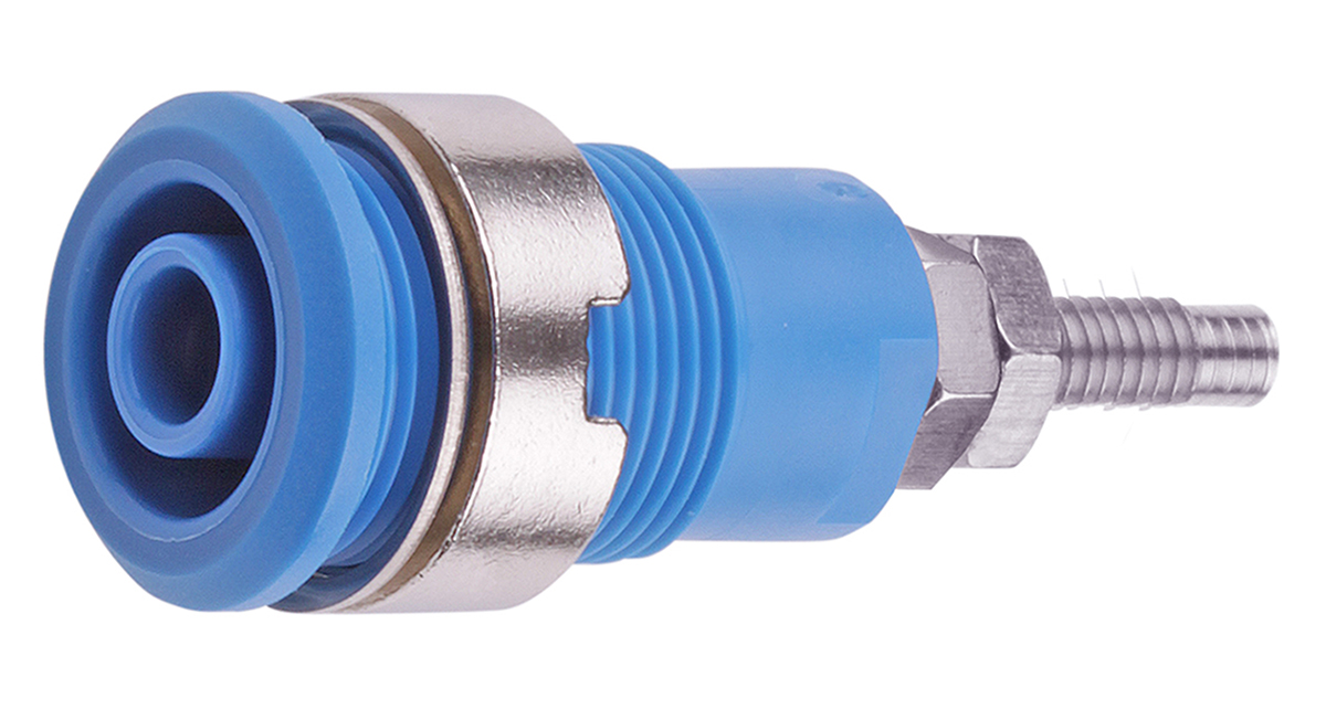This is Multi Contact Blue Female Banana Plug - Solder 1kV manufactured by Staubli. The manufacturer part number is 49.7043-23. The product has a current rating of 32a. Moreover, the product has a nominal 1000v voltage rating. In addition, female is the available "Gender" of the product. Its accurate length is 38.5mm. It comes in banana socket configuration. The product is made from sturdy brass materials.