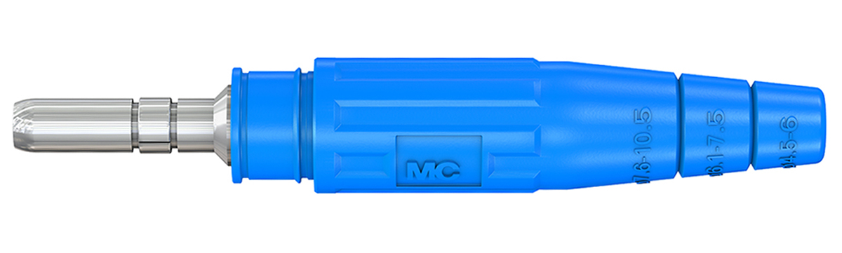 This is Multi Contact Blue Plug Banana Plug - Crimp 600V manufactured by Staubli. The manufacturer part number is 15.0001-23. The product has a current rating of 80a. Moreover, the product has a nominal 600v voltage rating. In addition, male is the available "Gender" of the product. Its accurate length is 89mm. It has a robust tpe insulation material. It comes in test connector configuration. The product is made from sturdy cuzn/cu materials.