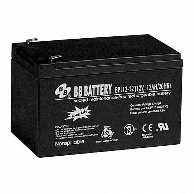 This is manufactured by B B Battery. The manufacturer part number is BPL12-12-T2. The module has the capacity of 12ah. It is assigned with possible HTSUS value of 8507.20.8041. The product is not applicable. Moreover, it has spade, .250" (6.3mm) terminal style. Its typical moisture sensitivity level is not applicable. The product is highly reliable with a long-lasting period of 12 months. It also exhibits voltage rating of 12 v. It is shipped in bulk. The product's diameters include 6.00" l x 3.92" w x 3.76" h (152.5mm x 99.5mm x 95.5mm). The typical product's weight is 4100 g. The product bpl, is a highly preferred choice for users. Features a sealed lead acid (sla, vrla) battery chemistry. The product is designated with the ear99 code number