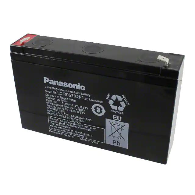 This is manufactured by Panasonic - BSG. The manufacturer part number is LC-R067R2P1. The module has the capacity of 7.2ah. It is assigned with possible HTSUS value of 8507.20.8031. The product is not applicable. Moreover, it has spade, .250" (6.3mm) terminal style. Its typical moisture sensitivity level is 1 (unlimited). The product is highly reliable with a long-lasting period of 12 months. It also exhibits voltage rating of 6 v. It is shipped in bulk. The product's diameters include 5.95" l x 1.34" w x 3.70" h (151.0mm x 34.0mm x 94.0mm). The typical product's weight is 1260 g. The product lc, is a highly preferred choice for users. Features a sealed lead acid (sla, vrla) battery chemistry. Moreover, it corresponds to lc-r067, a base product number of the product. The product is designated with the ear99 code number