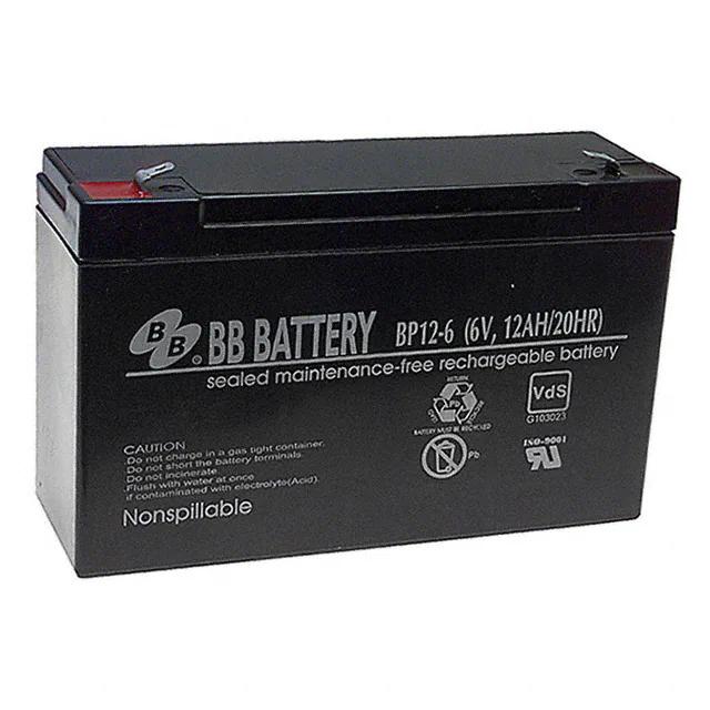 This is manufactured by B B Battery. The manufacturer part number is BP12-6-T1. The module has the capacity of 12ah. It is assigned with possible HTSUS value of 8507.20.8031. The product is not applicable. Moreover, it has spade, .187" (4.7mm) terminal style. Its typical moisture sensitivity level is not applicable. The product is highly reliable with a long-lasting period of 12 months. It also exhibits voltage rating of 6 v. It is shipped in bulk. The product's diameters include 6.00" l x 2.07" w x 3.76" h (152.5mm x 52.5mm x 95.5mm). It has a long 20 weeks standard lead time. The typical product's weight is 2000 g. The product bp, is a highly preferred choice for users. Features a sealed lead acid (sla, vrla) battery chemistry. The product is designated with the ear99 code number