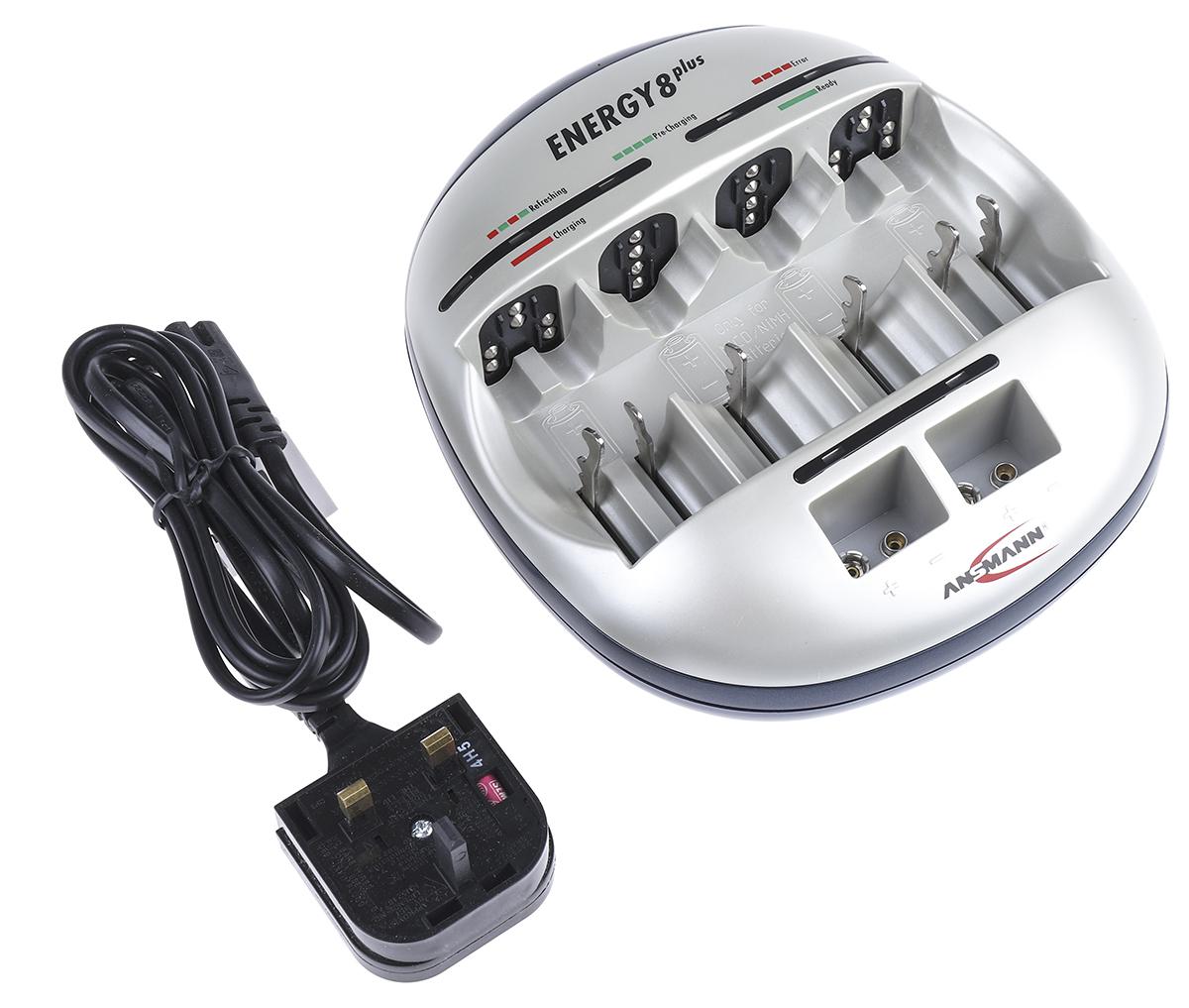 This is Energy 8 Plus 9V AA AAA C D Battery Charger EURO UK Plug manufactured by Ansmann. The manufacturer part number is 5207442/UK. The given dimensions of the product include 191 x 172 x 57mm.