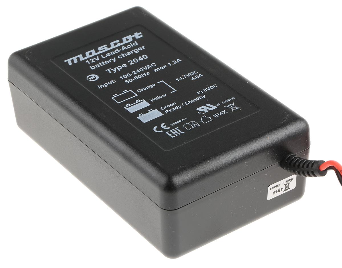 This is 12V 4A Switch Mode Battery Charger manufactured by Mascot. The manufacturer part number is 2040000051. The given dimensions of the product include 130 x 80 x 44mm. The typical product's weight is 350g.