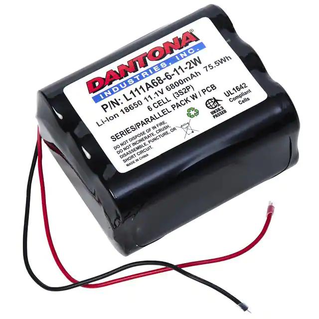 This is manufactured by Dantona Industries. The manufacturer part number is L111A68-6-11-2W. The module has the capacity of 3.4ah. It also exhibits voltage rating of 11.1 v. It is shipped in bulk. The product is rohs non-compliant. Moreover, it has wire leads terminal style. In addition, it is vendor undefined. It is comprised of 6 cells. The product's diameters include 2.10" l x 1.4" w x 2.70" h (53.3mm x 3.6mm x 68.6mm). The battery has a 18650 cell size. Features a lithium-ion battery chemistry. It has a side to side, 2 rows x 3 cells structure.