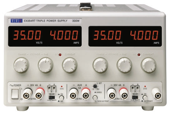 This is Bench Power Supply 3 Output 0 → 35 V 1.5 → 5 V 5 A 0 → 4 A 305W manufactured by Aim-TTi. The manufacturer part number is EX354RT. Features a versatile binding post terminal output connector. Additionally, the product is supplied with 3 outputs. The product ex-r, is a highly preferred choice for users. Input connector of iec 320. It comes in digital configuration.