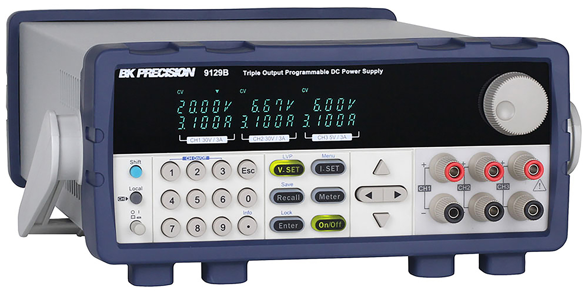 This is Bench Power Supply 3 Output 0 → 30 V 0 → 5 V 0 → 3A 195W manufactured by BK Precision. The manufacturer part number is BK9129B. Features a versatile binding post terminal output connector. Additionally, the product is supplied with 3 outputs. Input connector of iec 320. It comes in digital configuration.