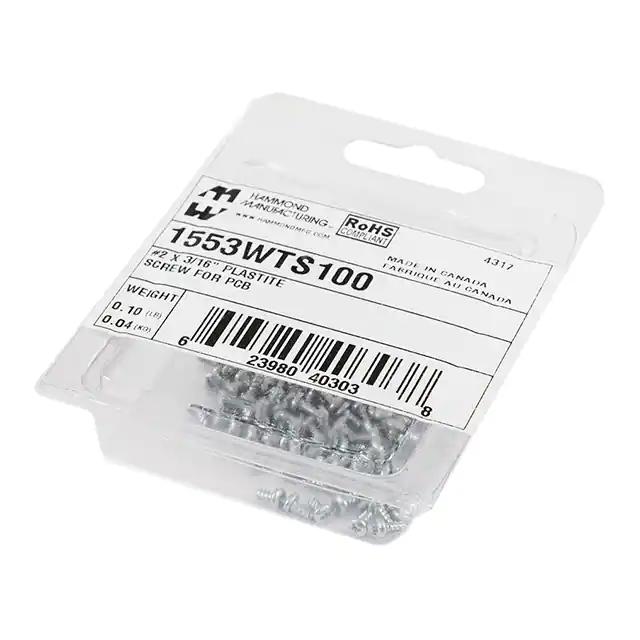 This is manufactured by Hammond Manufacturing. The manufacturer part number is 1553WTS100. It is assigned with possible HTSUS value of 7318.15.8085. It is shipped in bulk. The product 1553w, is a highly preferred choice for users. The product is rohs3 compliant. It is a type of screws accessory. In addition, it is reach unaffected. Its typical moisture sensitivity level is not applicable. Moreover, it corresponds to 1553, a base product number of the product. It has a long 4 weeks standard lead time. The product is suitable for use with enclosures. The product is designated with the ear99 code number