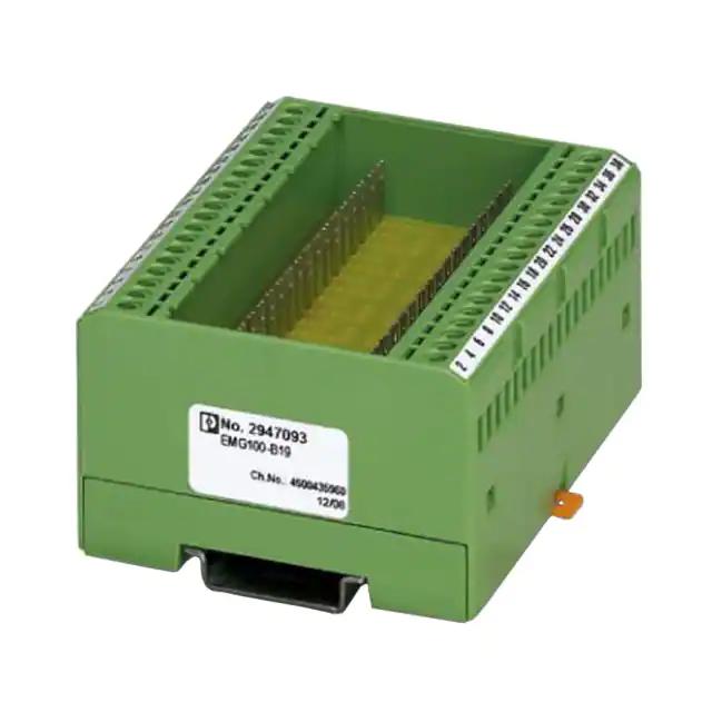 This is manufactured by Phoenix Contact. The manufacturer part number is 2947093. The product is rohs compliant. The splendid features of the product include positions - 38. It is assigned with possible HTSUS value of 8536.69.8000. It is shipped in bulk. It has a classic green colour. The product emg, is a highly preferred choice for users. The product is made from highly stable and reliable plastic, polycarbonate. Its typical moisture sensitivity level is not applicable. The product's diameters include 2.983" l x 3.937" w x 1.871" h (75.00mm x 100.00mm x 47.50mm). The product is suitable for use with 100mm wide housing. It has a long 8 weeks standard lead time. It comes in module configuration. The product is designated with the ear99 code number