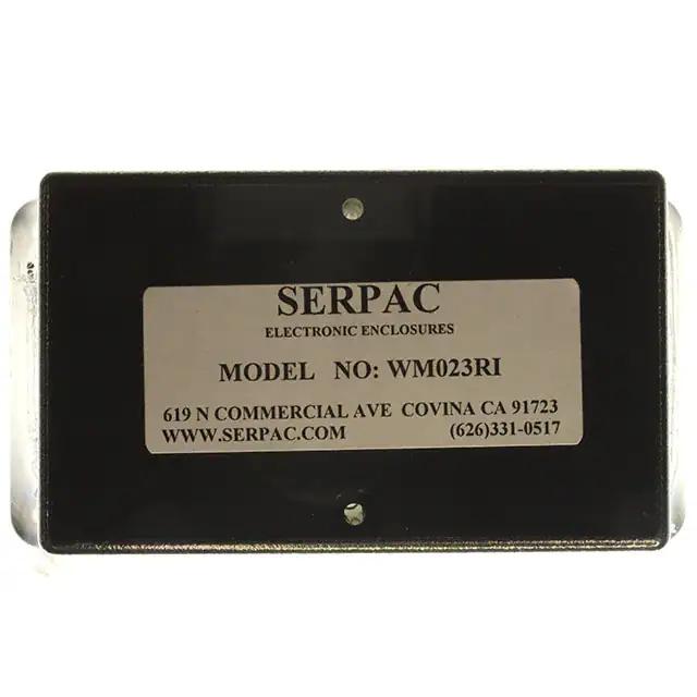 This is manufactured by Serpac. The manufacturer part number is WM023RI,BK. It is rated with ip40, nema 1. The product is made from highly stable and reliable plastic, abs. It is assigned with possible HTSUS value of 3923.10.9000. The product is rohs compliant. It is 0.100" (2.54mm) thick. Features a typical area dimensions of 10.7in² (69cm²). In addition, it is reach unaffected. A type of box container. It carries ul94 hb of material flammability rating. It is shipped in bulk. The product's diameters include 4.100" l x 2.600" w (104.14mm x 66.04mm). It has a long 2 weeks standard lead time. Shipping Information: shipped from digi-key. Its typical moisture sensitivity level is not applicable. The splendid features of the product include front access, mounting flange, pcb supports, wall mount. The typical product's weight is 0.187 lb (84.82 g). It has a classic black colour. The product wm, is a highly preferred choice for users. In addition, the height is 2.100" (53.34mm). Design Information: cover included. Moreover, it corresponds to wm023, a base product number of the product. The product is designated with the ear99 code number