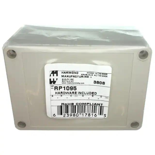 This is manufactured by Hammond Manufacturing. The manufacturer part number is RP1095. It is rated with ip65. The product is made from highly stable and reliable plastic, abs. It is assigned with possible HTSUS value of 3923.10.9000. The product is rohs3 compliant. It is 0.112" (2.84mm) thick. Features a typical area dimensions of 12.3in² (79cm²). In addition, it is reach unaffected. A type of box container. It carries ul94 hb of material flammability rating. It is shipped in bulk. The product's diameters include 4.134" l x 2.953" w (105.00mm x 75.00mm). It has a long 4 weeks standard lead time. Shipping Information: shipped from digi-key. Its typical moisture sensitivity level is not applicable. The splendid features of the product include pcb supports, watertight. The typical product's weight is 1 lb (453.59 g). It has a classic gray colour. The product rp, is a highly preferred choice for users. In addition, the height is 2.165" (55.00mm). Design Information: cover included. The product is designated with the ear99 code number