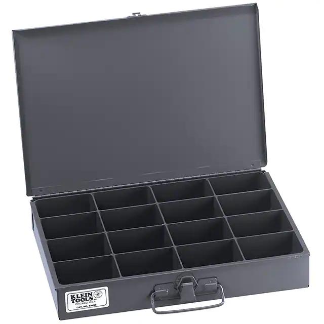 This is manufactured by Klein Tools, Inc.. The manufacturer part number is 54438. The product is made from highly stable and reliable metal, steel. It is assigned with possible HTSUS value of 7310.29.0065. The product is not applicable. Features a typical area dimensions of 130in² (839cm²). A type of component storage container. It is shipped in bulk. The product's diameters include 13.307" l x 9.764" w (338.00mm x 248.00mm). Shipping Information: shipped from digi-key. Its typical moisture sensitivity level is not applicable. The splendid features of the product include compartments/drawers - 16. The typical product's weight is 4.4 lbs (2 kg). It has a classic gray colour. In addition, the height is 2.008" (51.00mm). Design Information: hinged door, lid. The product is designated with the ear99 code number