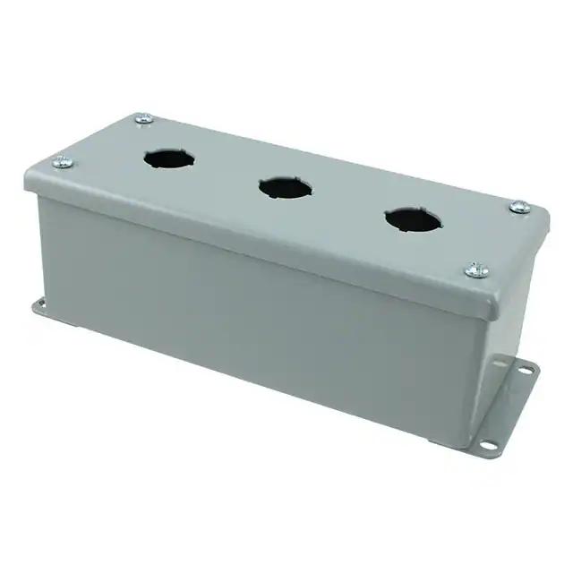 This is manufactured by Hoffman Enclosures, Inc.. The manufacturer part number is E3PBG. It is rated with ip65, nema 12, 13, ul-508a. The product is made from highly stable and reliable metal, steel. It is assigned with possible HTSUS value of 7310.29.0065. The product is rohs3 compliant. It is 14 gauge thick. Features a typical area dimensions of 26.0in² (168cm²). In addition, it is reach unaffected. A type of box container. It is shipped in bulk. The product's diameters include 7.992" l x 3.268" w (203.00mm x 83.00mm). It has a long 3 weeks standard lead time. Shipping Information: shipped from digi-key. Its typical moisture sensitivity level is 1 (unlimited). The splendid features of the product include mounting flange, pushbutton holes - 3. The typical product's weight is 2.7 lbs (1.2 kg). It has a classic gray colour. In addition, the height is 2.756" (70.00mm). Design Information: cover included. Moreover, it corresponds to e3pb, a base product number of the product. The product is designated with the ear99 code number