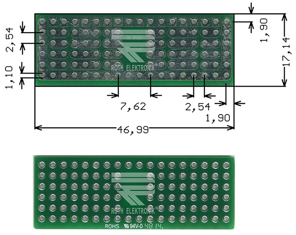 This is Breadboard Solderable Breadboard With Adaption Circuit Board 46.99 x 17.14 x 1.5mm manufactured by Roth Elektronik. The manufacturer part number is RE941-S2. The given dimensions of the product include 46.99 x 17.14 x 1.5mm. In addition, the height is 1.5mm. Furthermore, the product is 17.14mm wide. Its accurate length is 46.99mm. It comes in solderable breadboard with adaption circuit board configuration.