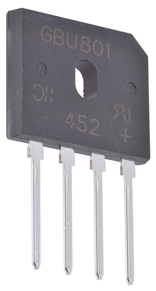 This is Diodes Inc Bridge Rectifier 8A 100V 4-Pin GBU manufactured by DiodesZetex. The manufacturer part number is GBU801. The given dimensions of the product include 22.3 x 3.56 x 18.8mm. In addition, the height is 18.8mm. Furthermore, the product is 3.56mm wide. Its accurate length is 22.3mm. Whereas, the minimum operating temperature of the product is -55 °c. The product is available in through hole configuration. The product is available in single configuration. It has a maximum operating temperature of +150 °c.