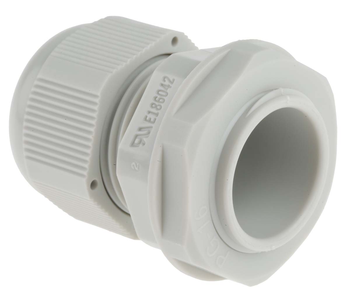 This is PG16 Grey Nylon IP68 Cable Gland With Locknut manufactured by RS Pro. The manufacturer part number is 822-9650. The product is made from highly stable and reliable nylon 66. It has a typical thread size of pg16.