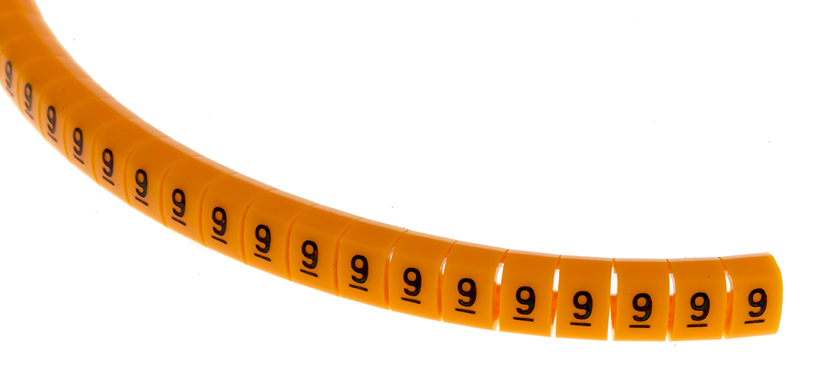 This is Snap On Cable Marker Pre-printed 9 Black on Orange 4 → 5mm Dia. Range manufactured by RS Pro. The manufacturer part number is 812-1420. The product is made from highly stable and reliable nylon 6. Its accurate length is 4mm. Legend Information: 9. Available in 100 quantity.