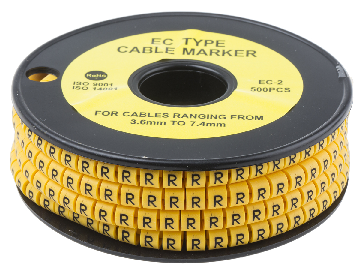 This is Slide On Cable Marker Pre-printed R Black on Yellow 3.6 → 7.4mm Dia. Range manufactured by RS Pro. The manufacturer part number is 812-1029. The product is made from highly stable and reliable pvc. Its accurate length is 5mm. It has a maximum operating temperature of +85°c. Legend Information: r. Available in 500 quantity.