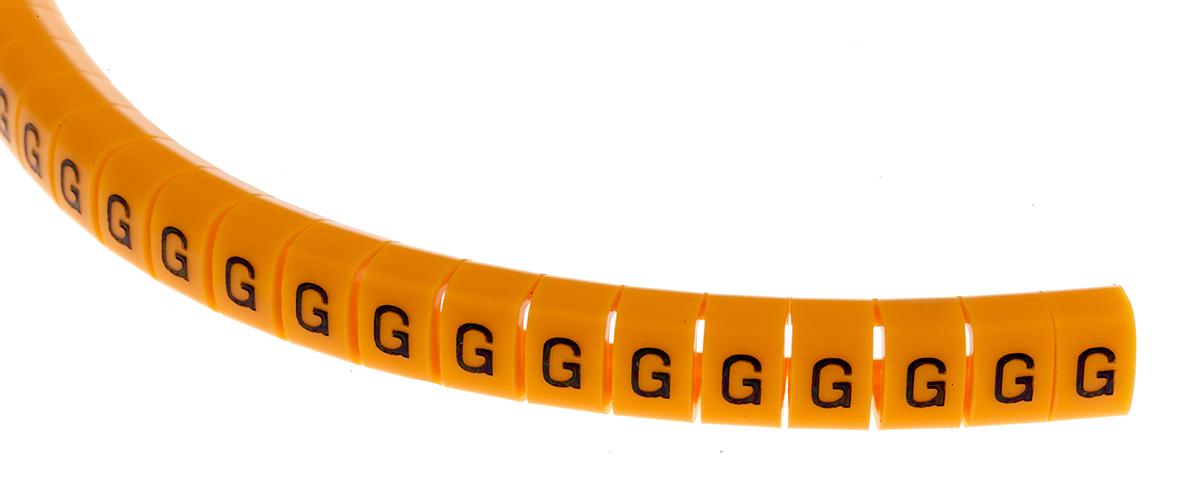 This is Snap On Cable Marker Pre-printed G Black on Orange 4 → 5mm Dia. Range manufactured by RS Pro. The manufacturer part number is 812-1445. The product is made from highly stable and reliable nylon 6. Its accurate length is 4mm. Legend Information: g. Available in 100 quantity.