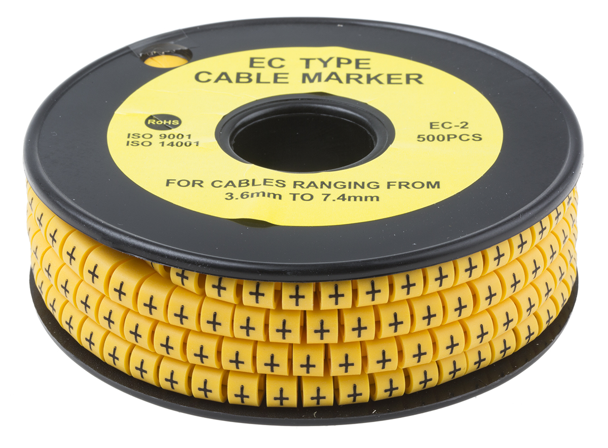 This is Slide On Cable Marker Pre-printed + Black on Yellow 3.6 → 7.4mm Dia. Range manufactured by RS Pro. The manufacturer part number is 812-1051. The product is made from highly stable and reliable pvc. Its accurate length is 5mm. It has a maximum operating temperature of +85°c. Legend Information: +. Available in 500 quantity.