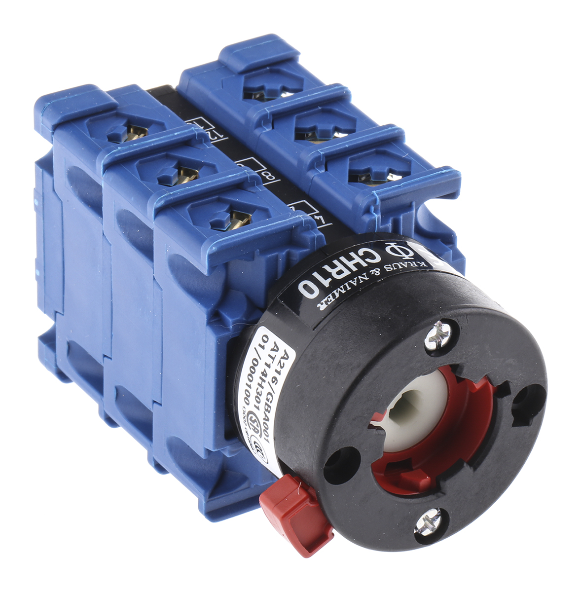 This is 3 positions 60° Rotary Switch 690 V 20 A Knob Spring Return manufactured by Kraus & Naimer. The manufacturer part number is CHR10A216/GBA001 * FT. It has a throw angle 60°. Furthermore, the product is 48mm wide. Its accurate length is 48mm. The product carries possible position value of 3.