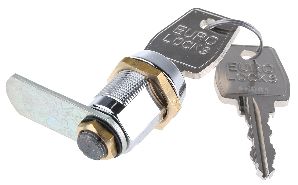 Twin-Entry Cam Lock Lock with cam in 12 o'clock orientation and fixed with nut. It is supplied with 2 keys offering up to 2000 different combinations. It opens by being turned 90° to the right, is released at 12 o'clock and locked at 3 o'clock. The key is free in the locked position. Finish: Shiny chrome and stainless steel cover.