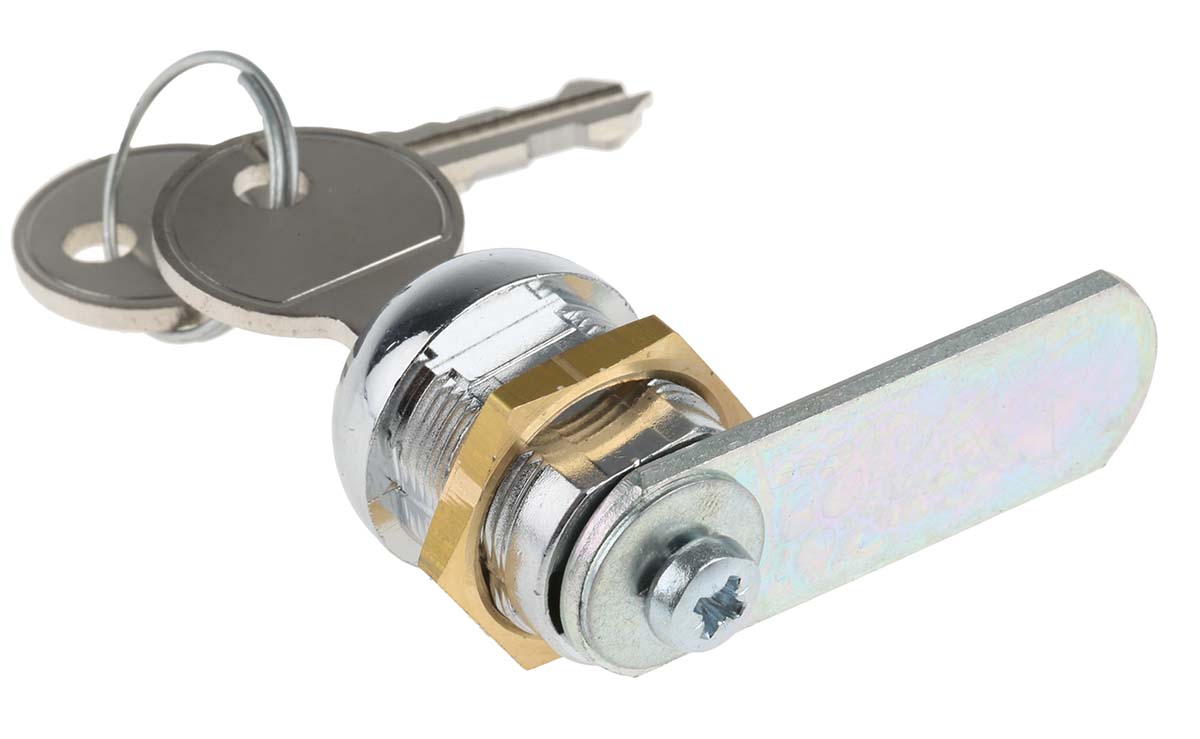Lock with Dust Screen This lock has a dust screen. It is therefore particularly recommended for outdoor applications. The body length of this lock is 16mm. It is mounted on panels with a maximum thickness of 8 mm by means of a nut. 180° movement with key free in both positions. Supplied with 2 twin-entry keys, cam 40 mm long and screw-mounted.