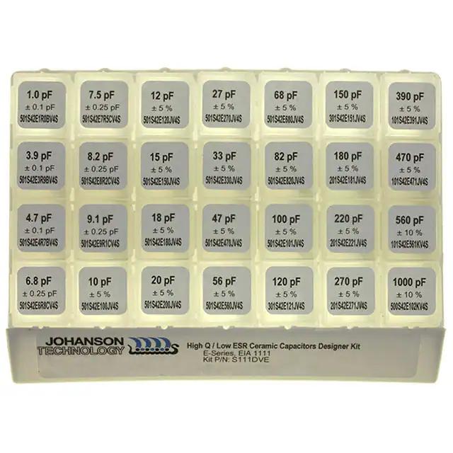 This is manufactured by Johanson Technology Inc.. The manufacturer part number is S111DVE. It is assigned with possible HTSUS value of 8532.24.0020. The product is rohs3 compliant. It features ±0.1pf, ±0.25pf, ±5%, ±10% of tolerance value. It also exhibits voltage rating of 50 ~ 500v. In addition, it is reach unaffected. The product is widely employed in rf, microwave, high frequency. It is shipped in box. Its typical moisture sensitivity level is 1 (unlimited). It has a long 6 weeks standard lead time. Available in 280 pieces (28 values - 10 each) quantity. The ceramic is designed to provide robust applications in a variety of specific settings. The splendid features of the product include high q, low loss, high voltage. The product is available in surface mount, mlcc configuration. The product e, is a highly preferred choice for users. The product is designated with the ear99 code number