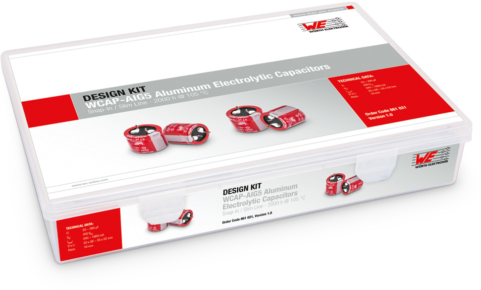 This is Snap-In Aluminium Capacitor Sample Kit manufactured by Wurth Elektronik. The manufacturer part number is 861021. The product is available in snap-in configuration. Moreover, the product is constructed from highly aluminium dielectric material. While the voltage range is 450v dc.