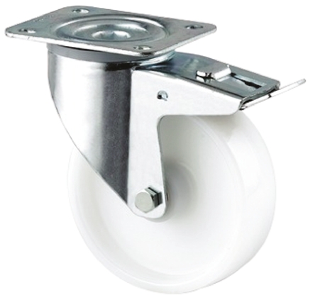 This is Swivel Castor 350kg manufactured by Tente. The manufacturer part number is 3477UOR200P63. The product is available in plate configuration. Allows braked swivel rotation.