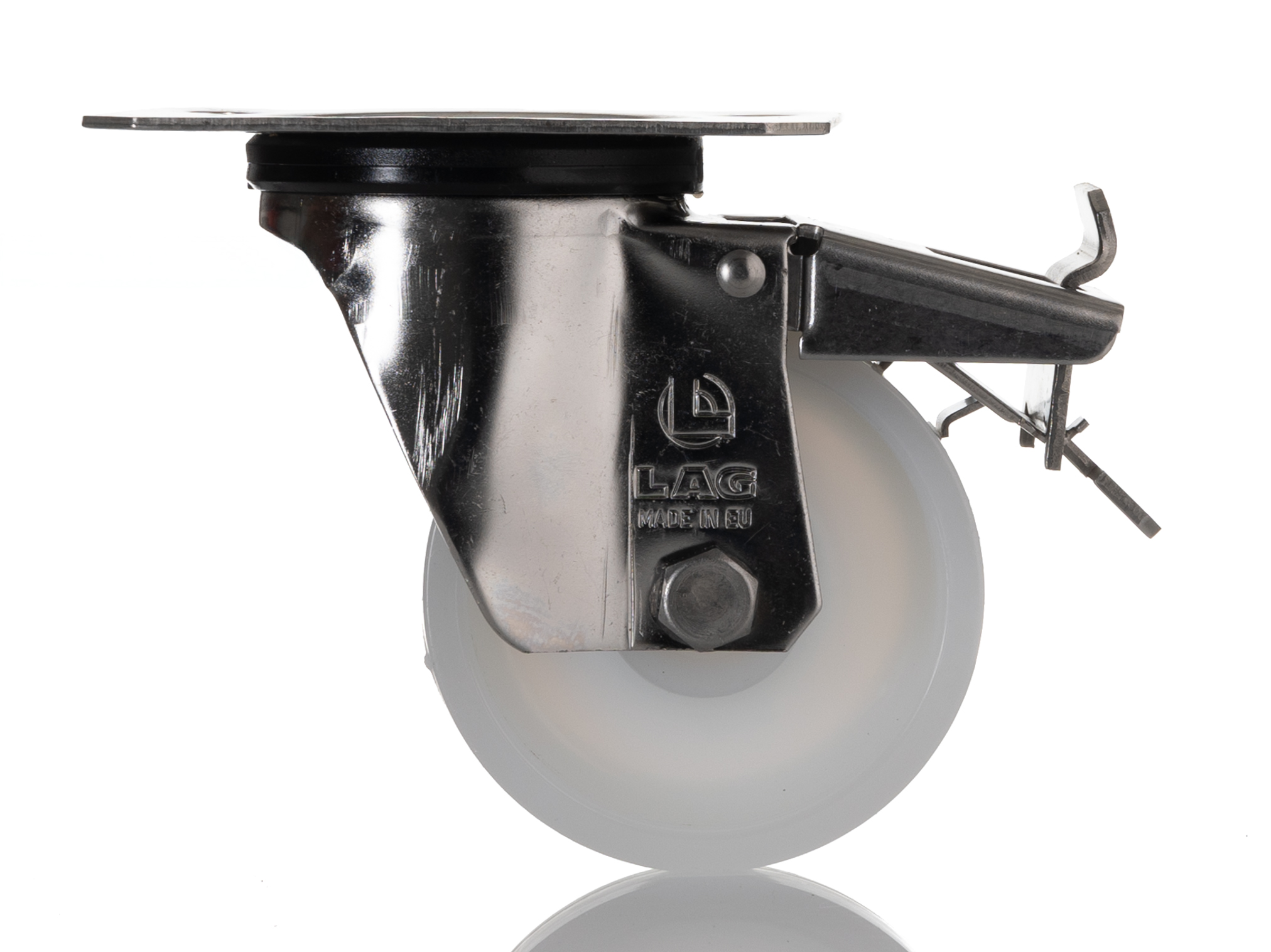 This is Swivel Castor 150kg manufactured by LAG. The manufacturer part number is 17127 FR. The product is available in plate configuration. Allows braked swivel rotation.