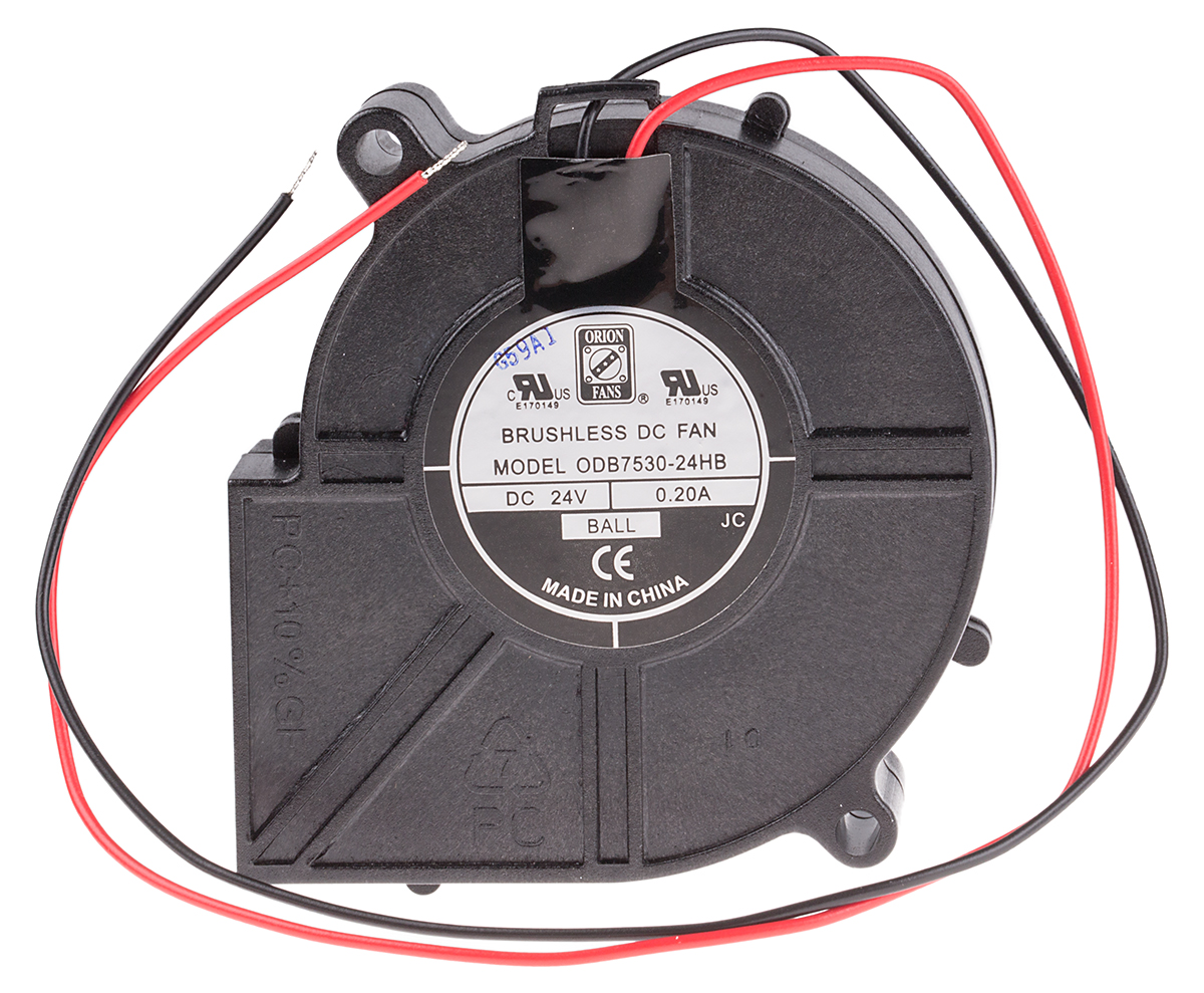 This is Blower 75 x 75 x 30mm 16.99m³/h 24 V dc (ODB7530 Series) manufactured by RS Pro. The manufacturer part number is 787-4013. The product has a 0.35in/h2o static pressure. The given dimensions of the product include 75 x 75 x 30mm. The given diameter of mounting hole is 4.5mm. This has integrated with a ball, a bearing with long-lasting features. In addition, the height is 75mm. Furthermore, the product is 75mm wide. The product comes in 30mm depth. It has a 10cfm air flow rate. These sensors are sort of tachometer, temperature.