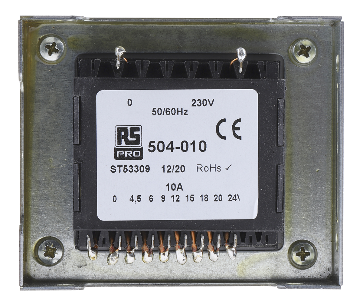 This is 240VA 1 Output Chassis Mounting Transformer 4.5V ac 6V ac 9V ac 12V ac 18V ac 20V ac 24V ac manufactured by RS Pro. The manufacturer part number is 504-010. Additionally, the product is supplied with 1 outputs. The given dimensions of the product include 100 x 92 x 82mm. The typical product's weight is 2.8kg. Its accurate length is 100mm. Furthermore, the product is 92mm wide. The product comes in 82mm depth. The product is available in chassis configuration.