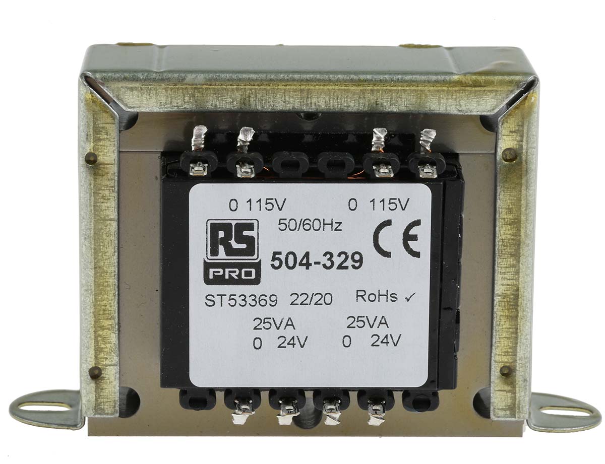 This is 50VA 2 Output Chassis Mounting Transformer 24V ac manufactured by RS Pro. The manufacturer part number is 504-329. Additionally, the product is supplied with 2 outputs. The given dimensions of the product include 79 x 62 x 65mm. The typical product's weight is 1kg. Its accurate length is 79mm. Furthermore, the product is 62mm wide. The product comes in 65mm depth. The product is available in clamp mount configuration.
