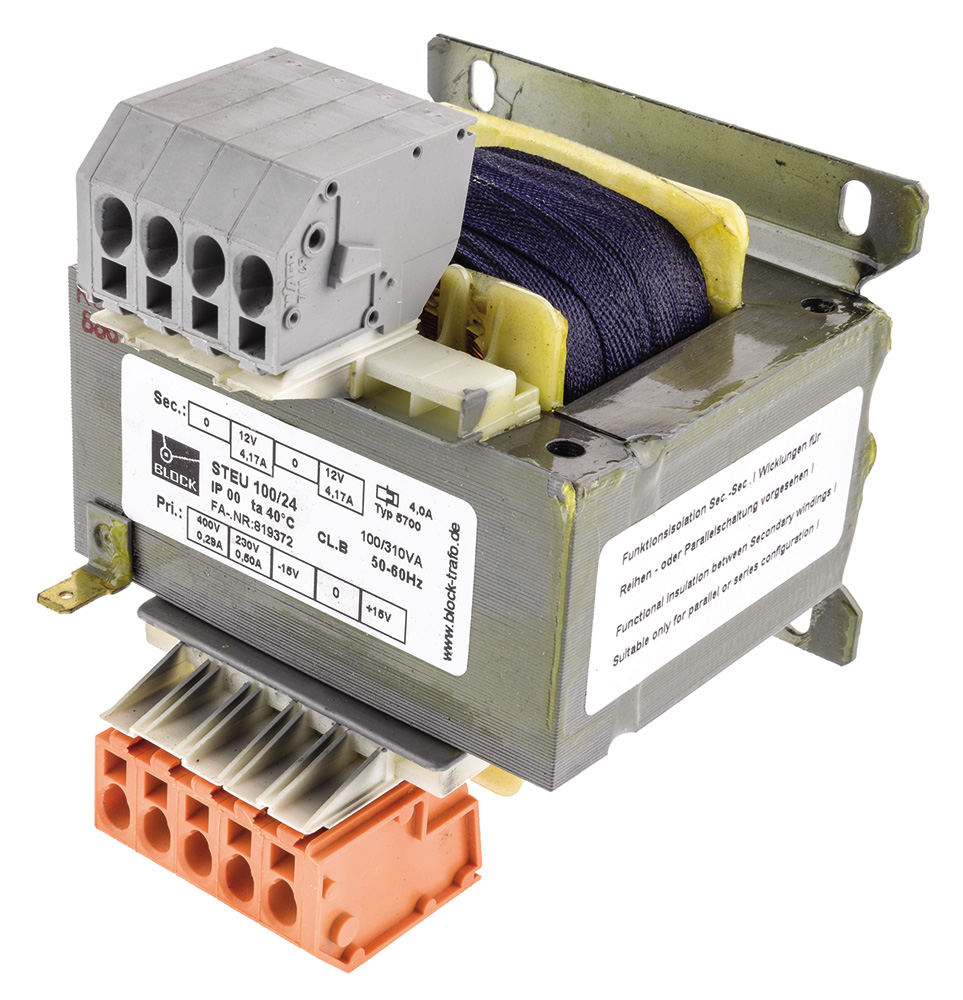 This is 100VA Isolating Transformer 215V ac 230V ac 245V ac 385V ac 400V ac 415V ac Primary 2 x 12V ac Secondary manufactured by Block. The manufacturer part number is STEU100/24. Additionally, the product is supplied with 2 outputs. The given dimensions of the product include 84 x 96 x 85mm. The typical product's weight is 2.1kg. Its accurate length is 84mm. Furthermore, the product is 84mm wide. The product comes in 85mm depth. The product is available in din rail, panel configuration.