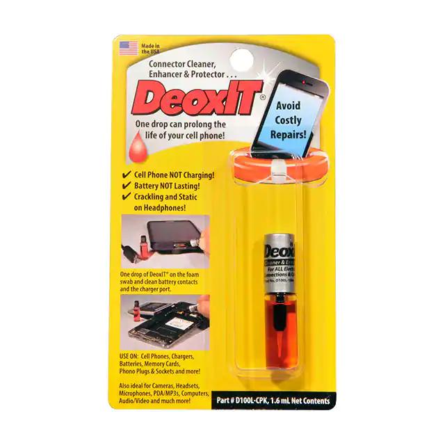 This is manufactured by CAIG Laboratories, Inc.. The manufacturer part number is D100L-CPK. It is assigned with possible HTSUS value of 3402.50.5100. The product is rohs compliant. The product is highly reliable with a long-lasting period of 60 months. It comes in cleaner configuration. In addition, it is reach unaffected. Its warranty starts from date of manufacture. The product is widely employed in electronics. It offers storage features at 120°f (49°c). It is shipped in retail package. Its typical moisture sensitivity level is 1 (unlimited). It has a long 5 weeks standard lead time. The product deoxit® d, is a highly preferred choice for users. The product is available in 1.6ml size. Moreover, it corresponds to d100l, a base product number of the product. The product is designated with the ear99 code number