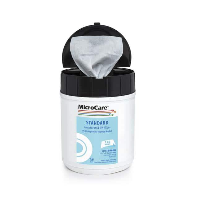This is manufactured by MicroCare Corporation. The manufacturer part number is MCC-IPA99W. It is assigned with possible HTSUS value of 2905.12.0050. The product is rohs3 compliant. It comes in wipes, pre-saturated configuration. In addition, it is reach unaffected. The product is widely employed in hand cleaning, sanitizing. It is shipped in box. Its typical moisture sensitivity level is not applicable. It has a long 1 weeks standard lead time. The product is available in 5" x 8" size. The product is designated with the ear99 code number