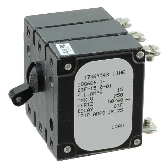 This is manufactured by Sensata-Airpax. The manufacturer part number is IDG666-1-63F-15.0-01. It is assigned with possible HTSUS value of 8536.20.0020. The product is rohs compliant. It is approved by ul1077. The product exhibits 250 v of AC voltage rating. It is shipped in bulk. It is a type of magnetic (hydraulic delay) breaker. It has a long 7 weeks standard lead time. Additionally, the product's output is 15a Its typical moisture sensitivity level is 1 (unlimited). The product is available in panel mount configuration. The product idg, is a highly preferred choice for users. The product carries lever actuator. Is this product illuminated? none. It has equipped with 1 poles. Moreover, it corresponds to idg666-1-63, a base product number of the product. The product is designated with the ear99 code number