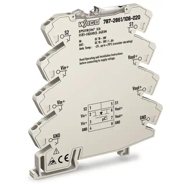This is manufactured by WAGO Corporation. The manufacturer part number is 787-2861/108-020. It is assigned with possible HTSUS value of 8536.20.0020. The product is rohs3 compliant. It is approved by ce, dnv gl, eac, ul. It is shipped in bag. 24 v of DC voltage rating. It has a long 12 weeks standard lead time. Additionally, the product's output is 8a Its typical moisture sensitivity level is not applicable. The product is available in din rail configuration. The product carries not included actuator. Is this product illuminated? none. It has equipped with 1 poles. The product is designated with the ear99 code number