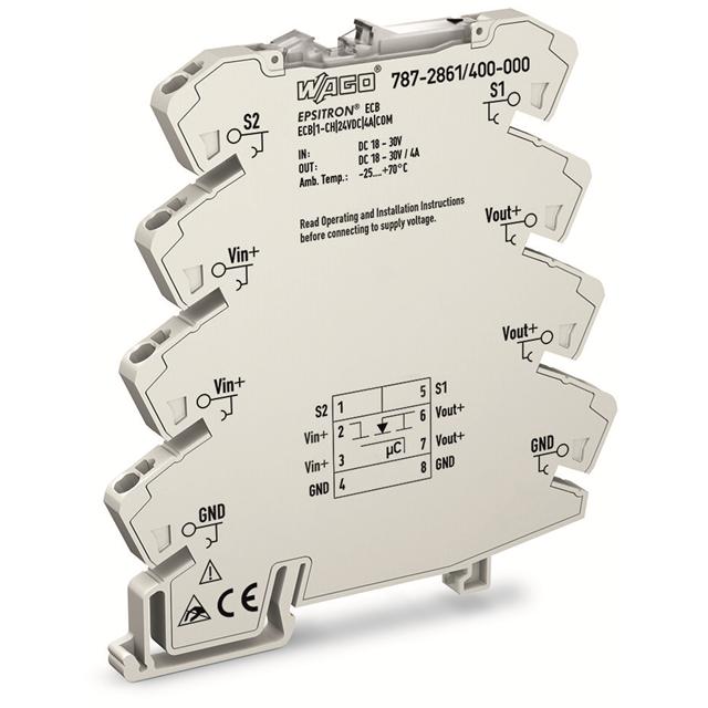 This is manufactured by WAGO Corporation. The manufacturer part number is 787-2861/400-000. It is assigned with possible HTSUS value of 8536.20.0020. The product is rohs3 compliant. It is approved by ce, dnv gl, eac, ul. It is shipped in bag. 24 v of DC voltage rating. It has a long 12 weeks standard lead time. Additionally, the product's output is 4a Its typical moisture sensitivity level is not applicable. The product is available in din rail configuration. The product carries not included actuator. Is this product illuminated? none. It has equipped with 1 poles. The product is designated with the ear99 code number