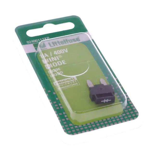 This is manufactured by Littelfuse Inc.. The manufacturer part number is 02400113XP. It is assigned with possible HTSUS value of 8541.10.0080. It is shipped in bulk. The product mini®, is a highly preferred choice for users. The product is rohs3 compliant. It is a type of mini® diode, blade accessory. In addition, it is reach unaffected. Its typical moisture sensitivity level is 1 (unlimited). The product is suitable for use with automotive. It has a long 22 weeks standard lead time. The product is designated with the ear99 code number