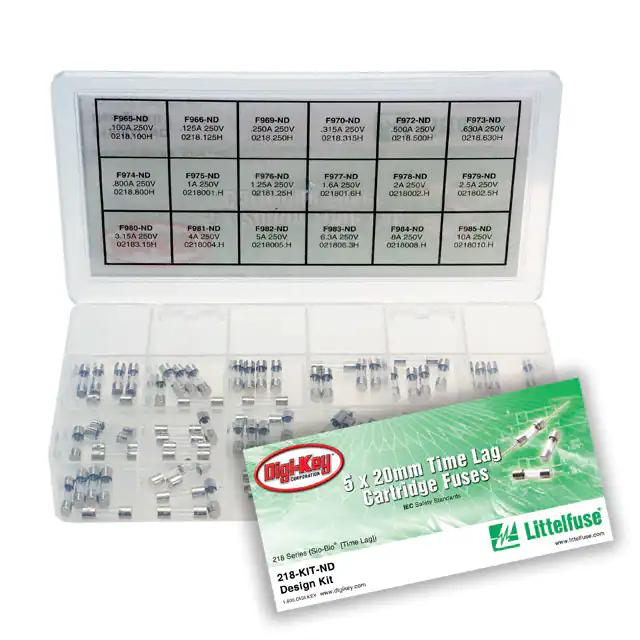 This is manufactured by Littelfuse Inc.. The manufacturer part number is 218P-KIT. It is assigned with possible HTSUS value of 8536.10.0020. The product is rohs3 compliant. Moreover, the product has a nominal 250vac voltage rating. It responds within slow blow. It is shipped in case. Its typical moisture sensitivity level is 1 (unlimited). Additionally, the product's output is 0.1 ~ 10a Available in 90 pieces (18 values - 5 each) quantity. The cartridge, glass is designed to provide robust applications in a variety of specific settings. The product is available in holder configuration. The product 218, is a highly preferred choice for users. The product is designated with the ear99 code number