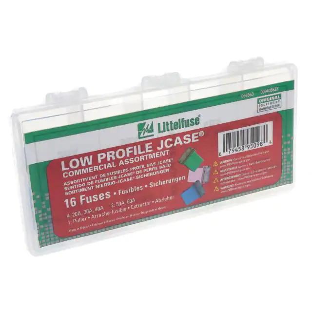 This is manufactured by Littelfuse Inc.. The manufacturer part number is 00940553Z. It is assigned with possible HTSUS value of 8536.10.0040. The product is rohs3 compliant. Moreover, the product has a nominal 32vac, 32vdc voltage rating. In addition, it is reach unaffected. The product is also supplied with fuse puller. It responds within slow blow. It is shipped in case. Its typical moisture sensitivity level is 1 (unlimited). It has a long 12 weeks standard lead time. Additionally, the product's output is 20 ~ 60a Available in 14 pieces (assorted per value) quantity. The automotive is designed to provide robust applications in a variety of specific settings. The product is available in holder configuration. The product jcase®, is a highly preferred choice for users. The product is designated with the ear99 code number