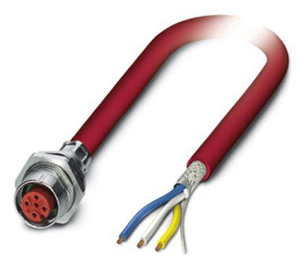 This is manufactured by Phoenix Contact. The manufacturer part number is 1437847. Its accurate length is 5m. This connector has a a orientation. It is assigned with possible HTSUS value of 8544.42.9090. The product is rohs compliant. The cable is constructed from highly durable polyvinyl chloride (pvc) materials. The product's typical Applications include uses in industrial environments. Furthermore, the product is shielded with shielded. While the loaded positions on first connector are all. The size of the first connector's shell - insert is m12. The second connector is the wire leads. The product is designed in a standard assembly configuration. It is shipped in bulk. Its typical moisture sensitivity level is 1 (unlimited). Its accurate length is 1.64' (500.00mm). The first connectors are female sockets. It has a long 12 weeks standard lead time. plug is the first connector. The first connector contains 4 positions. It is IP rated with ip67 - dust tight, waterproof. It has a classic red colour. It is a typical round cable. The first connector is configured with a panel mount mounting type. The product is designated with the ear99 code number