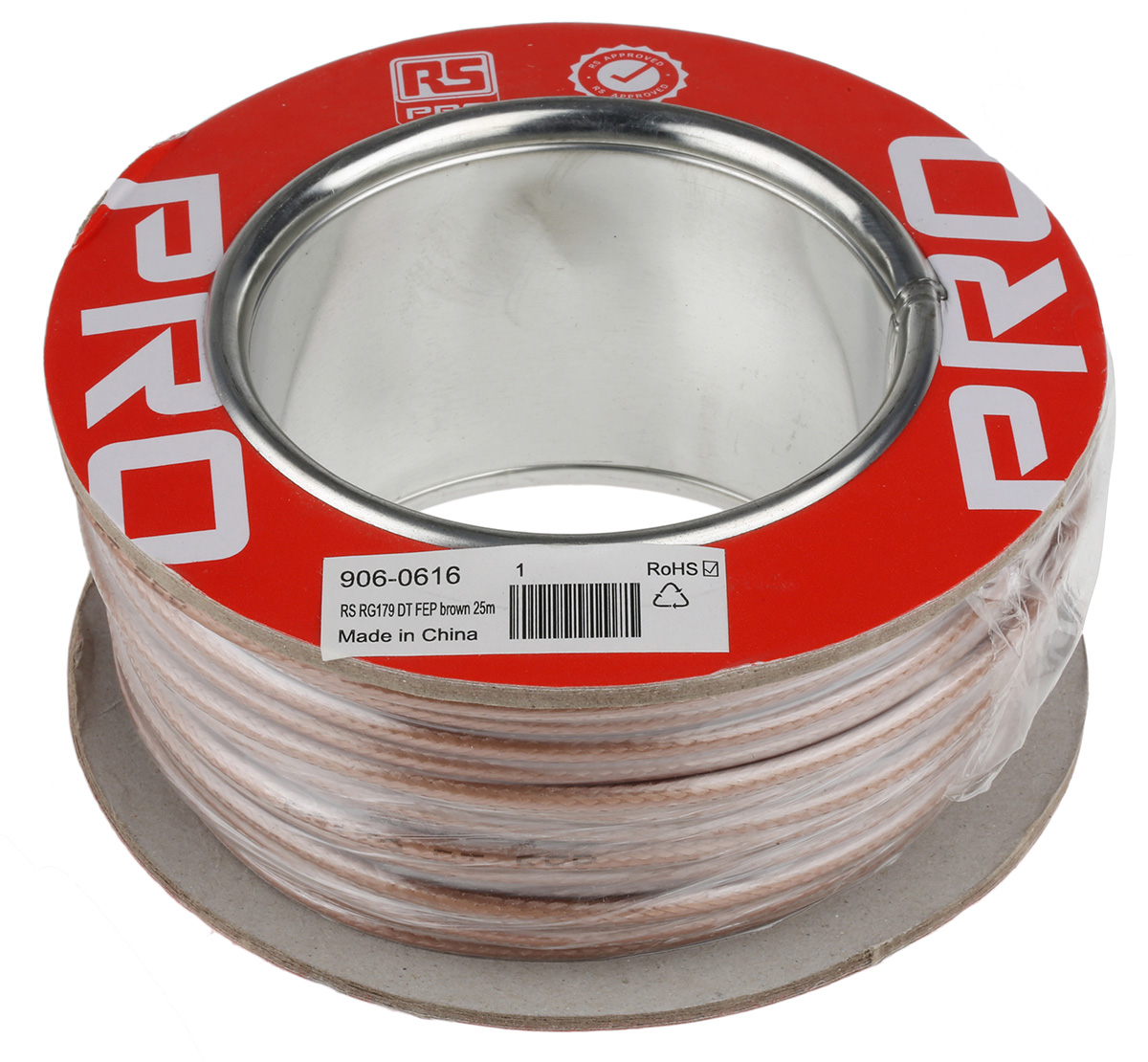 This is Brown RG179 Coaxial Cable FEP Sheath 75 Ω manufactured by RS Pro. The manufacturer part number is 906-0616. It has a robust ptfe insulation material. Furthermore, the product is shielded with silver plated copper braid. The conductor is made from silver plated copper clad steel material. It has a maximum operating temperature of +200°c. It provides a 64pf/m of capacitance value. Whereas, the minimum operating temperature of the product is -70°c.