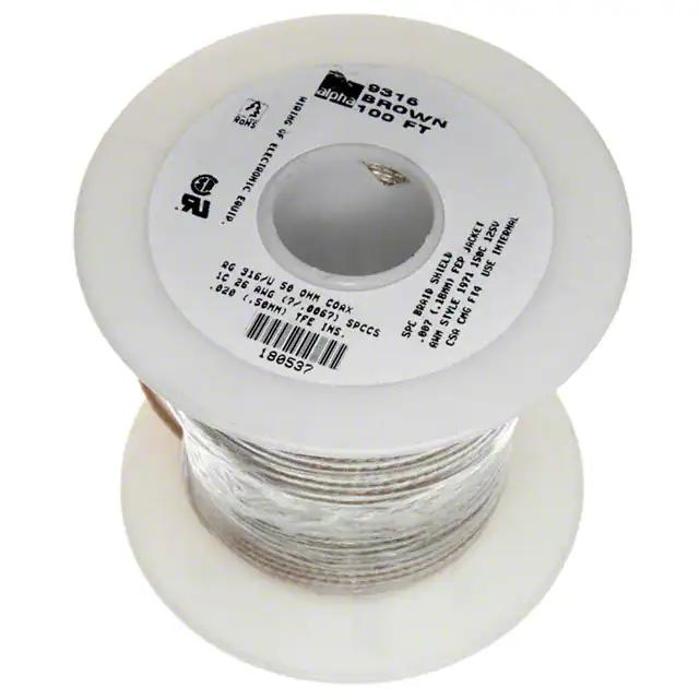 This is manufactured by Alpha Wire. The manufacturer part number is 9316 BR005. It is assigned with possible HTSUS value of 8544.20.0000. The product is rohs3 compliant. Its jacket is made from highly insulated fluorinated ethylene-propylene (fep) materials. It also features a 7 strands / 0.0067" conductor strand. Moreover, the product is constructed from highly tetrafluoroethylene (tfe) dielectric material. In addition, it is reach unaffected. It has an impedance value of 50 ohms. Cable Group Options: rg-316. It is shipped in spool. Moreover, the product has a wire gauge of 25 awg. The item is shielded with a braid. Its typical moisture sensitivity level is 1 (unlimited). Its accurate length is 100.0' (30.48m). It has a long 29 weeks standard lead time. It covers shielding capability up to 93%. The diameter of the jacket is 0.098" (2.48mm). The conductor is made from steel, copper covered, silver coated material. It is a typical coaxial cable. The product is shielded with a robust copper, silver coated shield materials. The product is designated with the ear99 code number Moreover, it corresponds to 9316, a base product number of the product. It comes in nice brown colour.