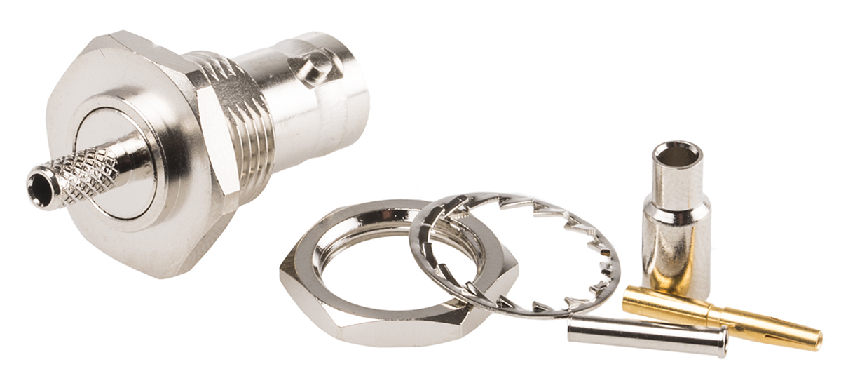 This is Straight 50Ω Panel Mount BNC Connector jack Nickel Crimp Termination RG174 A/U RG188 A/U RG316/U manufactured by TE Connectivity. The manufacturer part number is 1-1337548-0. The product is available in panel mount configuration. In addition, female is the available "Gender" of the product. It is a typical rg174 a/u, rg188 a/u, rg316/u cable. It has an impedance value of 50ω. It has a maximum operating temperature of +165°c. Whereas, the minimum operating temperature of the product is -65°c. The product is made from sturdy brass materials.