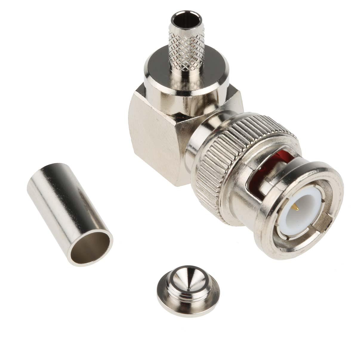This is Right Angle 50Ω Cable Mount BNC Connector Plug Nickel Crimp Termination RG58 manufactured by RS Pro. The manufacturer part number is 546-3872. The product is available in cable mount configuration. In addition, male is the available "Gender" of the product. It is a typical rg58 cable. It has an impedance value of 50ω. The product is made from sturdy brass materials.